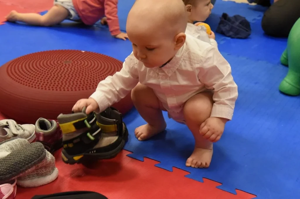 11-12 miesiąc to także początek zmiany płaszczyzny podparcia, bo Maluch już nie tylko trzyma się obydwiema rączkami, ale potrafi również trzymać się 1 rączką, skręcić górną partię ciała, obejrzeć się za siebie czy w bok, chwycić przedmiot w wolną rękę i zrzucić go na dół. Potrafi również bardzo swobodnie, po wejściu w pozycję stojącą, ugiąć kolanka oraz biodra i kucnąć. Często to kucanie odbywa się przez śmieszne klapnięcie na pupę – bezpiecznym jest wówczas aby maluch upadając, upadał na pupę, a nie sztywno do tyłu na plecki. Te umiejętności doskonali on przez kolejny, charakterystyczny dla tego okresu element, który ja nazywam hopsie-hopsie. Czyli Maluch w przyspieszonym tempie kuca i prostuje kolanka, kuca i prostuje kolanka, trzymając się oburącz miejsca swojego podporu.